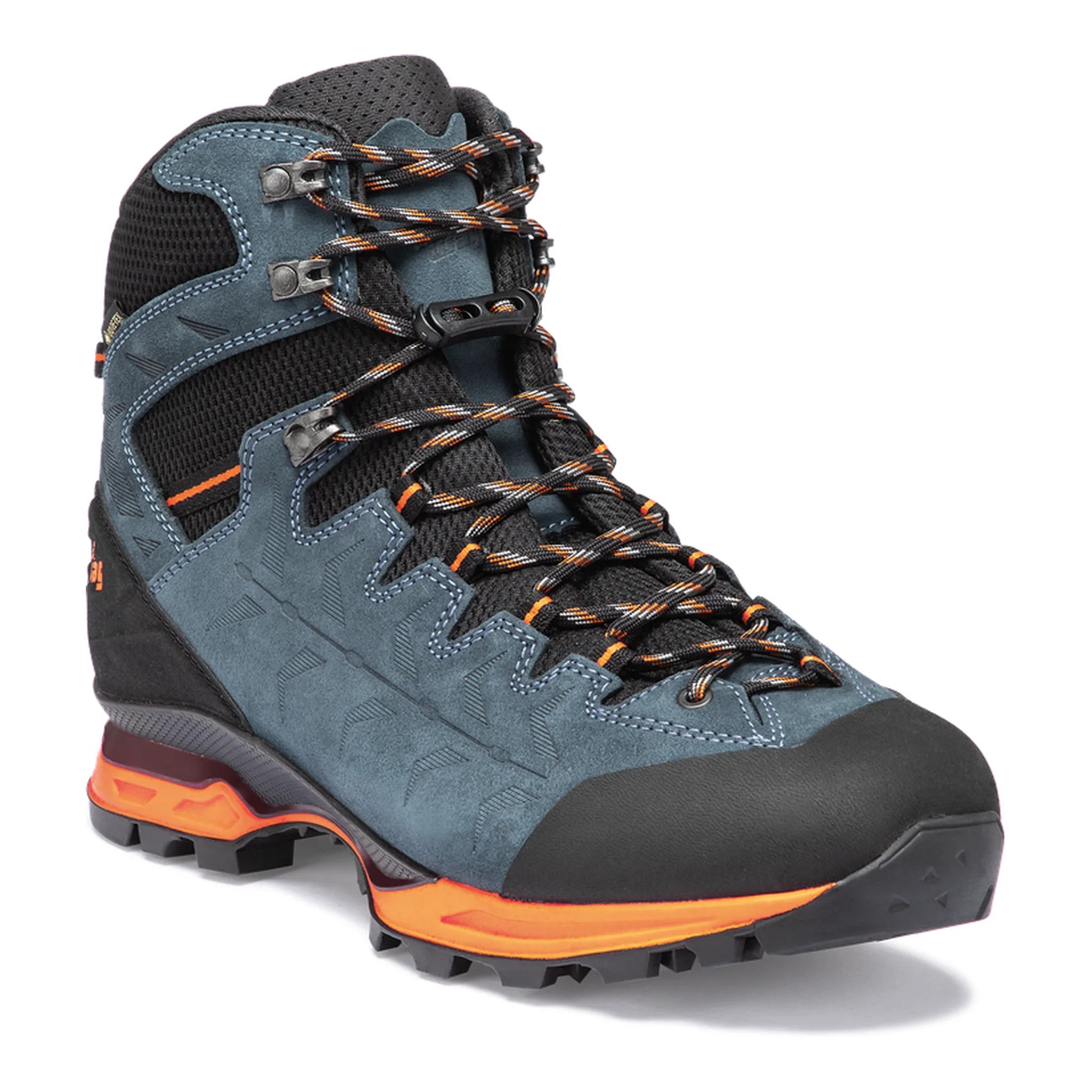 Der Makra Trek GTX hat einen besonders farbenfrohen und sportlichen Look. Er ist der passende Schuh für anspruchsvolle Touren im Alpenraum – mit leichtem Gepäck und bis an die 3000-Meter-Höhenlinie. Dank spezieller Profilgestaltung und Hanwag 3D Prism Base Technologie hat der Schuh eine sehr leichte und komfortable Sohlenkonstruktion. Die Vibram Integral Light bietet perfekte Dämpfung bei hoher Stabilität, welche durch die niedrigere Standhöhe gewährleistet wird. Für einen verbesserten Fersenhalt sorgt „Hanwag 2 Zone Lock“: eine Fixierung mit einer mechanischen Klemme. Im Gegensatz zu einem herkömmlichen Klemmhaken blockiert die mechanische Klemme zuverlässig und kann nach dem Fixieren nicht mehr – ohne manuelles Zutun – verrutschen. Sie lässt sich mit nur einem Handgriff regulieren. Dank wasserdichter GORE-TEX Membran bleiben die Füße auch bei nassen Bedingungen trocken. Das Perwanger Leder ist robust, atmungsaktiv und langlebig. Eine Materialkombination, die auf ganzer Linie überzeugt.